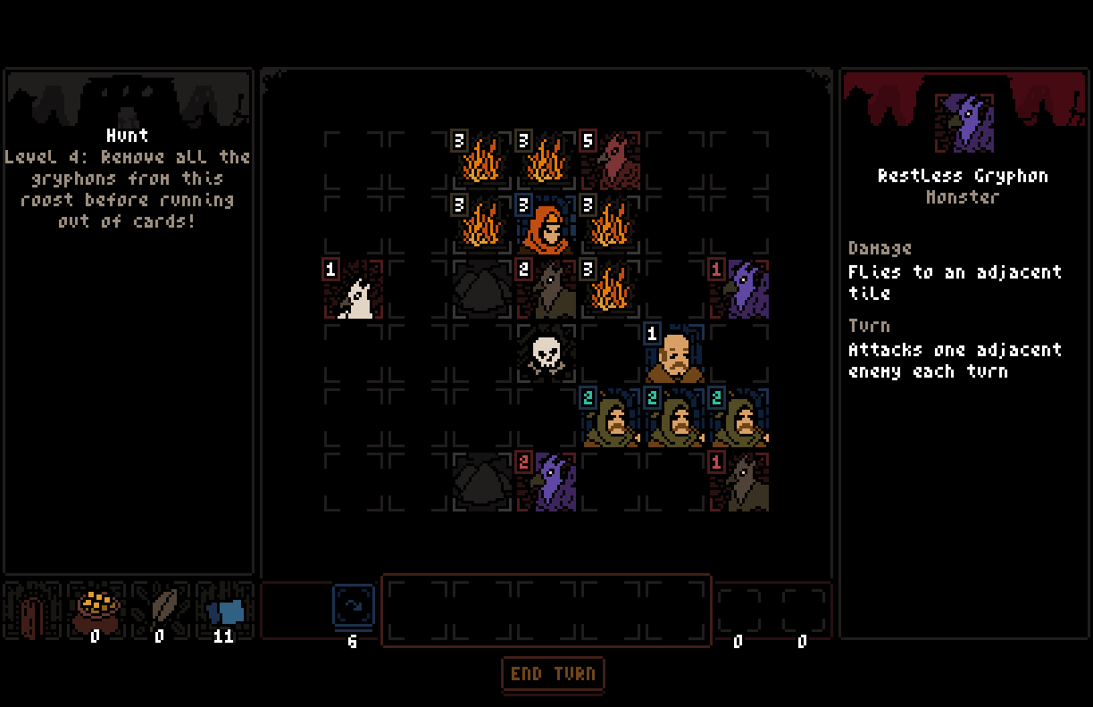 Build a party by adding cards to your deck then trying to play them tactically to clear out each roost of gryphons you visit.